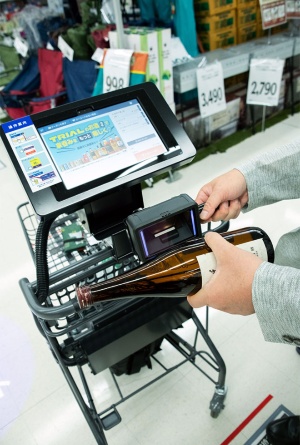 「お客様が、例えば『唐揚げ』を手に取り、そのバーコードをスマートショッピングカートでスキャンしたら、その唐揚げにふさわしいサントリーの酒類、例えば缶ハイボールなどが割引クーポン付きでタブレットに表示される。トライアルと一緒に、トライアル以外の他の流通も含めた過去の購入データを蓄積・分析する仕組みを構築しており、そのデータ分析によって、唐揚げとともに購入される確率の最も高い酒類をレコメンドし、購入機会の増加を図れる」