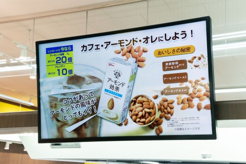 ヨーグルトなどを販売する洋日配の棚に設置されたデジタルサイネージ。スマートショッピングカートの利用でポイントが10~20倍になるとの情報を表示し、顧客にカート利用と商品の購入を促す