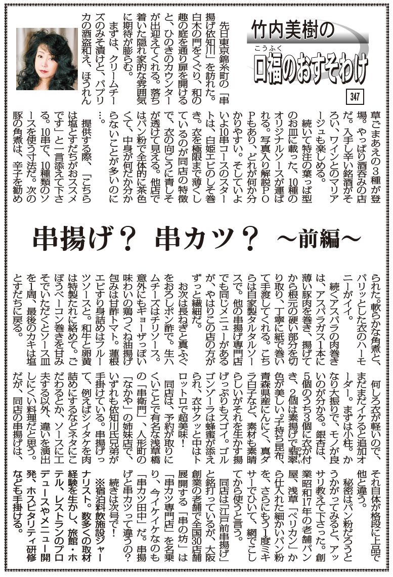 【竹内美樹の口福のおすそわけ 347】串揚げ?串カツ?~前編~ 宿泊料飲施設ジャーナリスト 竹内美樹 - 観光経済新聞