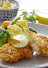 衣にパン粉とスライスアーモンドを使い、サックサクで香ばしい鱈のアーモンドフライです。