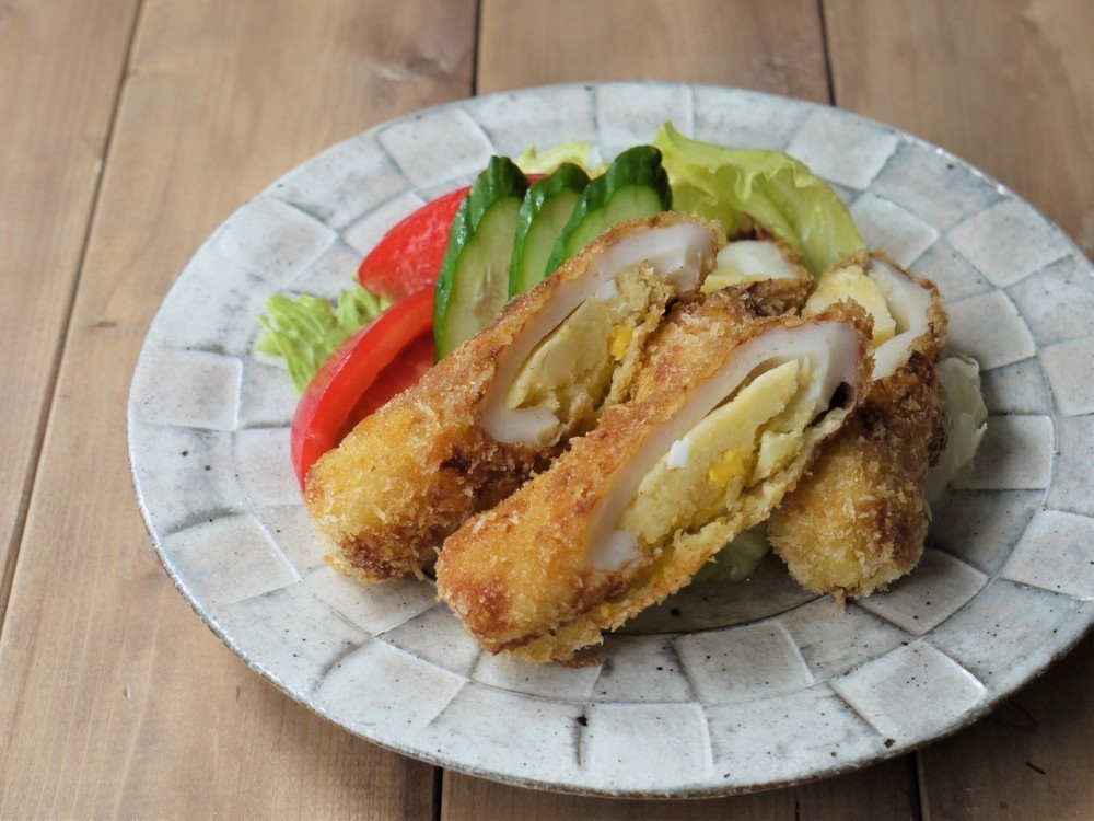 じゃがいもとゆで卵でポテトサラダを作り、ちくわに詰めて揚げ焼きするだけ。そのままでもおいしく食べられますが、お好みでソースをかけてもおいしいですよ。