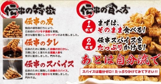 皮は余分な脂を落としてコラーゲンのみを残し美味しいパリもち食感に。伝串専用のタレは高麗人参の臭みを消して美味しい甘辛タレに。伝串専用スパイスは大豆を主原料に塩分ゼロを実現しながらもピリッとしたスパイス感に。そして、伝串をより多くのお客様に食べて頂きたいという願いから、鶏皮の美味しいタイ国に伝串専用のライン(工場)を設置して貿易商を取得し自社輸入をすることでボリュームがありながら50円という価格を実現しました。
