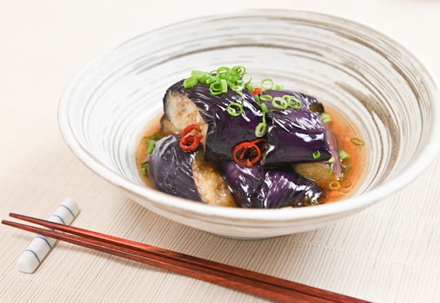 色素が溶け出すのを防ぐには素揚げ、油通しといった下ごしらえが大切になる。ナスの煮浸しや南蛮漬けでは切ったナスを160~180度の油で揚げてから、煮汁や漬け汁に加える。表面が油で覆われ、色素が汁に溶け出しにくくなるのだ。あらかじめ火を通しておくことで、煮汁に浸して調理するのにかかる時間を短縮する効果もある。