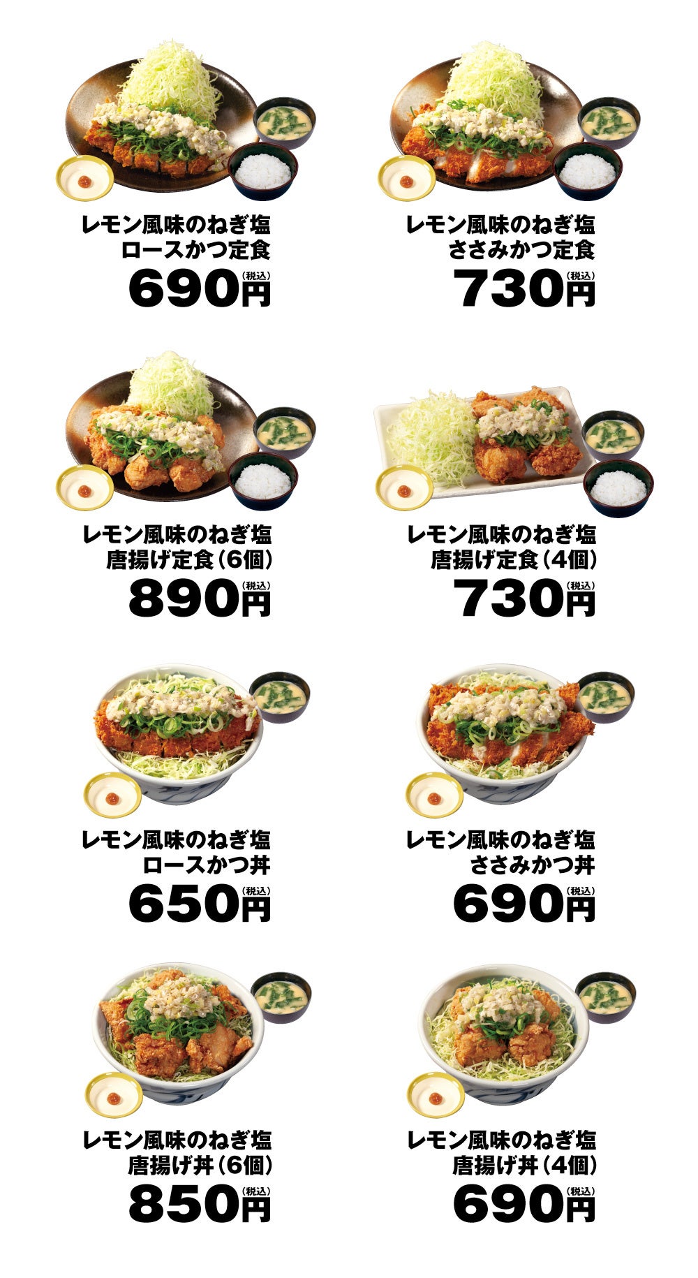 | 商品名 レモン風味のねぎ塩ロースかつ定食 690円 レモン風味のねぎ塩ささみかつ定食 730円 レモン風味のねぎ塩唐揚げ定食 (4個)730円(6個)890円 レモン風味のねぎ塩ロースかつ丼 650円 レモン風味のねぎ塩ささみかつ丼 690円 レモン風味のねぎ塩唐揚げ丼 (4個)690円(6個)850円 単品レモン風味のねぎ塩ダレ 130円 ※お持ち帰りいただけます。お持ち帰りのみそ汁は、別途60円でお買い求めいただけます。 ※全て税込価格です。また、店内・お持ち帰りの税込価格は同一です。 発売日 2022年6月8日(水)午後3時 |