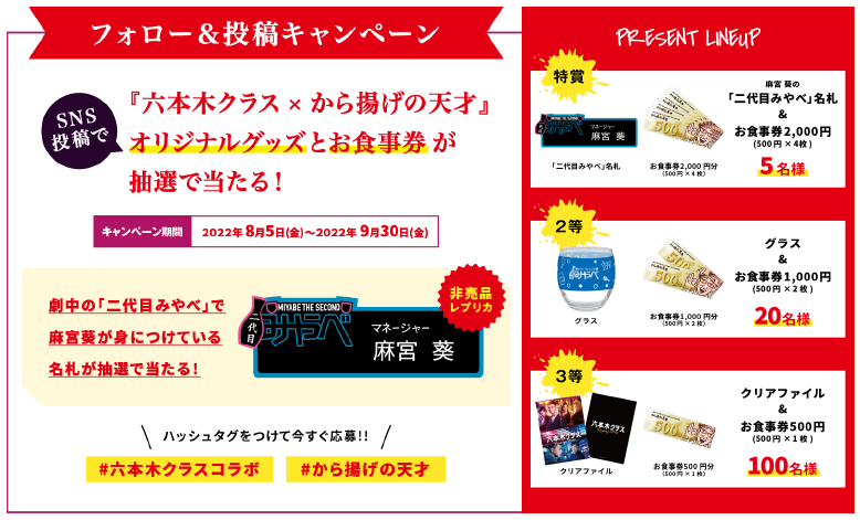 2022年8月5日(金)~SNS投稿で『六本木クラス×から揚げの天才』オリジナルグッズとお食事券が抽選で当たる!キャンペーンを開催しております。概要としては、Instagram・Twitterで『から揚げの天才』公式アカウントをフォローいただき、お買い上げいただいたコラボ商品を撮影、そして専用ハッシュタグをつけて投稿いただければ、抽選で当選者の方には、DMでご連絡後、商品を配送させていただきます。是非、この機会にドラマを視聴し、コラボ商品を購入して、キャンペーンに奮ってご参加くださいませ!