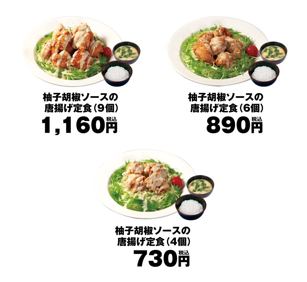 | 商品名 柚子胡椒ソースの唐揚げ定食 (4個)730円(6個)890円(9個)1,160円 単品柚子胡椒ソースの唐揚げ (4個)490円(6個)650円(9個) 920円 ※お持ち帰りいただけます。お持ち帰りのみそ汁は、別途60円でお買い求めいただけます。 ※全て税込価格です。また、店内・お持ち帰りの税込価格は同一です。 発売日 2022年8月17日(水)午後3時 |