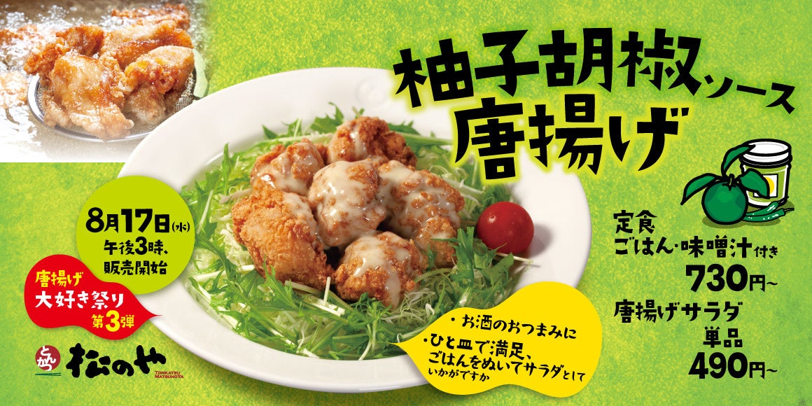 【松のや】夏の唐揚げ大好き祭り第3弾!「柚子胡椒ソースの唐揚げ」新発売 - PR TIMES