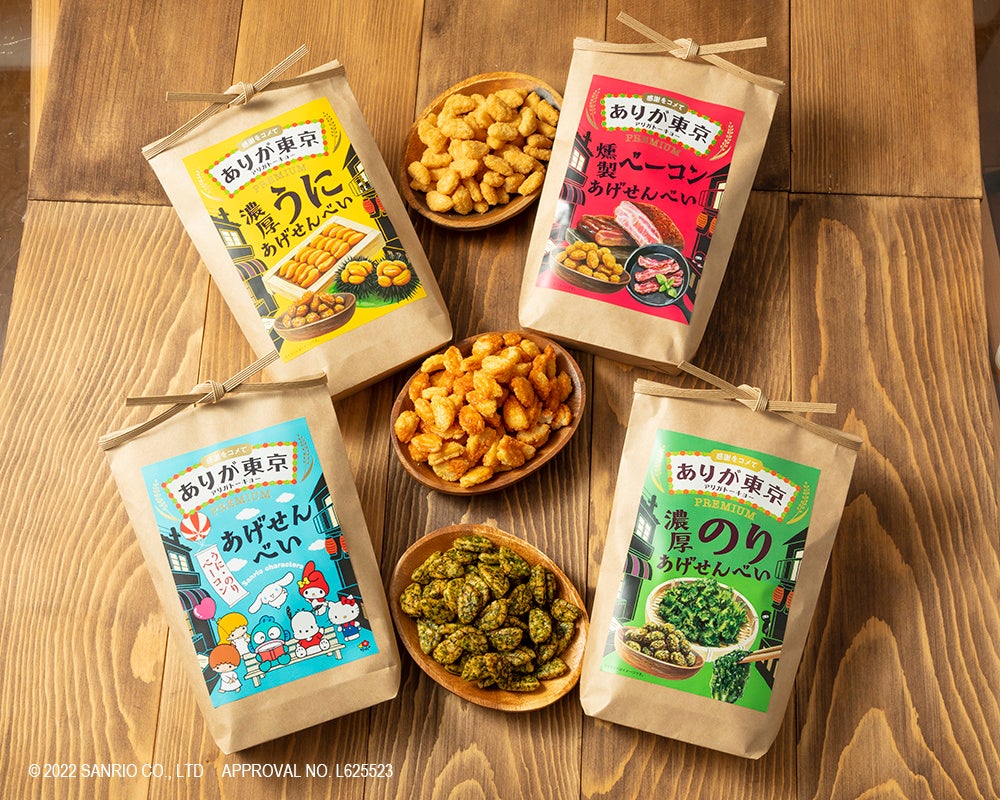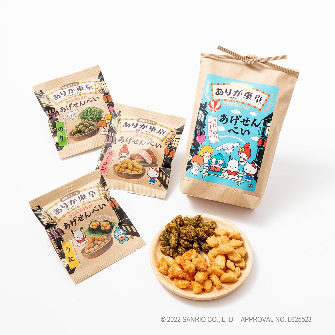 【濃厚うに味】【燻製ベーコン味】【濃厚のり味】3種のあげせんべい詰め合わせ。サンリオの大人気キャラクターたちと、パッケージコラボしました!