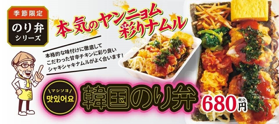 のり弁シリーズはこれまで多くの皆様にご愛顧いただき、大変なご好評をいただいております。「韓国のり弁」は本格的なヤンニョムソースに4種の彩りナムルを添えた食べ応え抜群の逸品です。ヤンニョムソースのコクと辛味がから揚げと絶妙にマッチし、口いっぱいに広がる美味しさで、この夏自信の一品です!