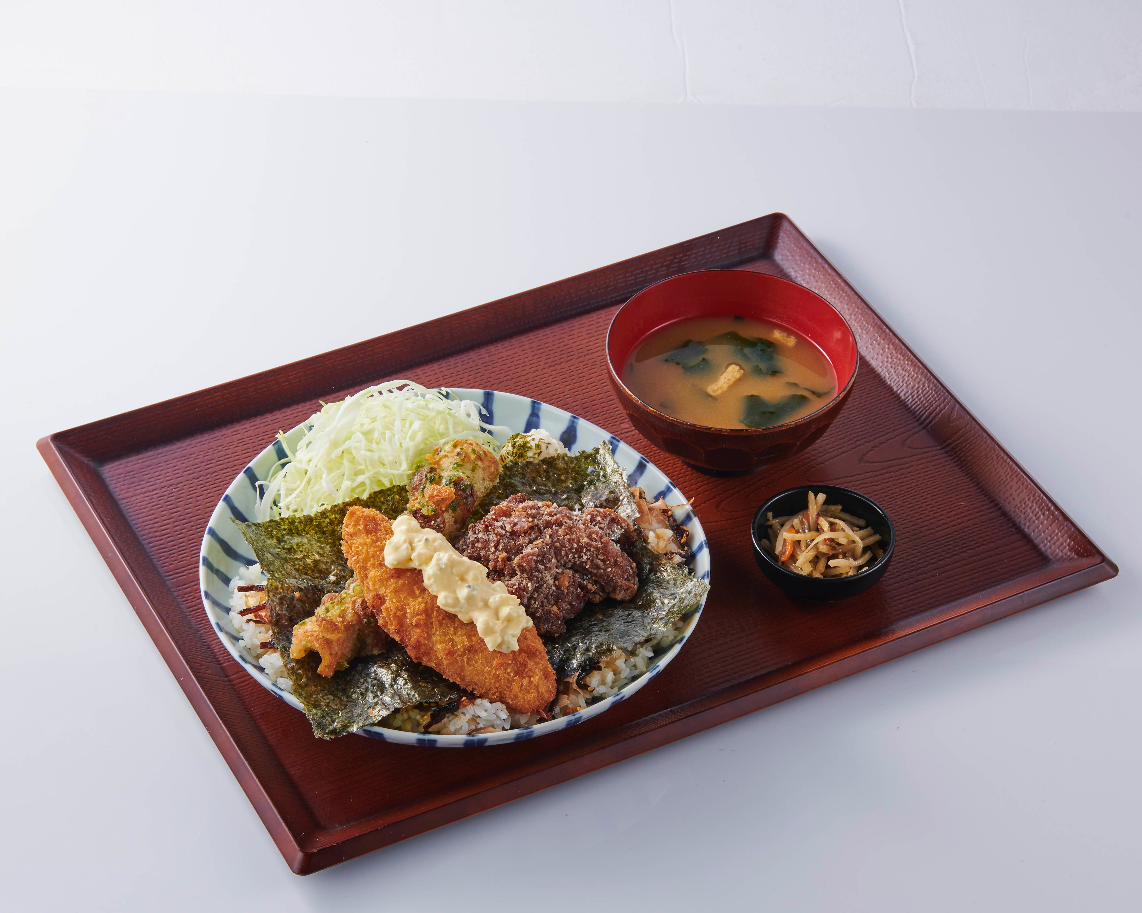 お持ち帰りで大人気の天才のり弁が、定食のお皿に盛られて、お店の中で食べられます。お味噌汁もついてきます。お店で食べるから、ふっくらご飯と揚げたてサクサクのおかずがたまりません。