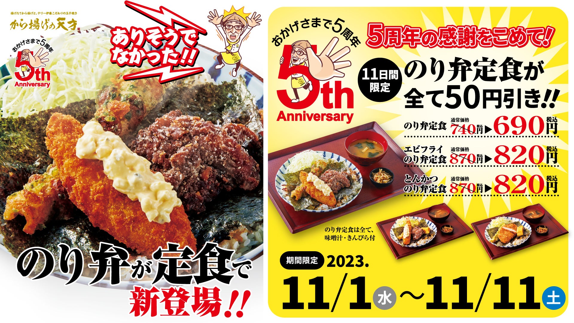 そして、さらにさらに!5周年企画として、日ごろの感謝を込めまして、2023年11月1日(火)から11日間で、のり弁定食が全て50円引き!もちろん、ご飯大盛もお値段据え置きでご提供しますので、お腹一杯大満足になれること間違いなし!ぜひ店内飲食で、から揚げの天才自信作の「のり弁定食」をお楽しみください!