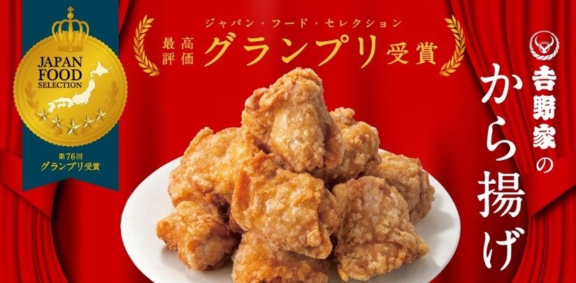 株式会社吉野家(本社:東京都中央区、代表取締役社長 河村泰貴、以下吉野家)は、中核商品「牛丼」に続く第二の柱として「から揚げ」を掲げ、全国900以上の店舗で販売しています。吉野家の「から揚げ」が一般社団法人フードアナリスト協会主催の「第76回ジャパン・フード・セレクション」スペシャリテ部門で飲食業界初となる最高評価の『グランプリ』を受賞したことをお知らせいたします。