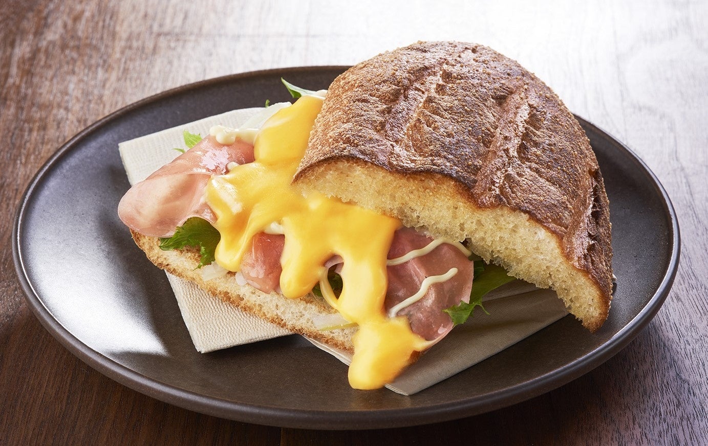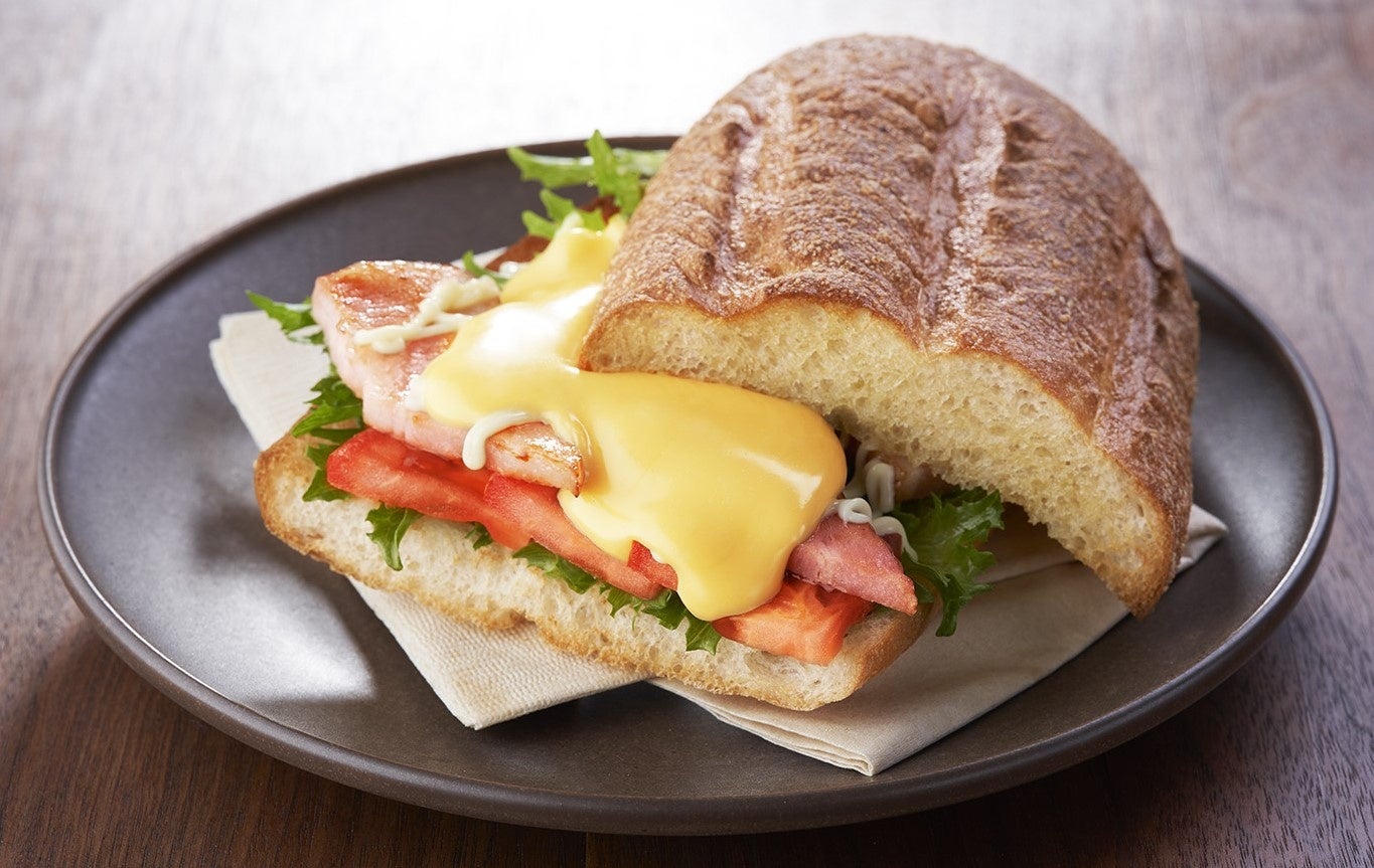 ハムとチーズの絶対的に美味しい組み合わせの商品。チェダーチーズの優しい塩味と柔らかいハムが魅力的で、フリルレタスや玉ねぎの食感もアクセントとなります。